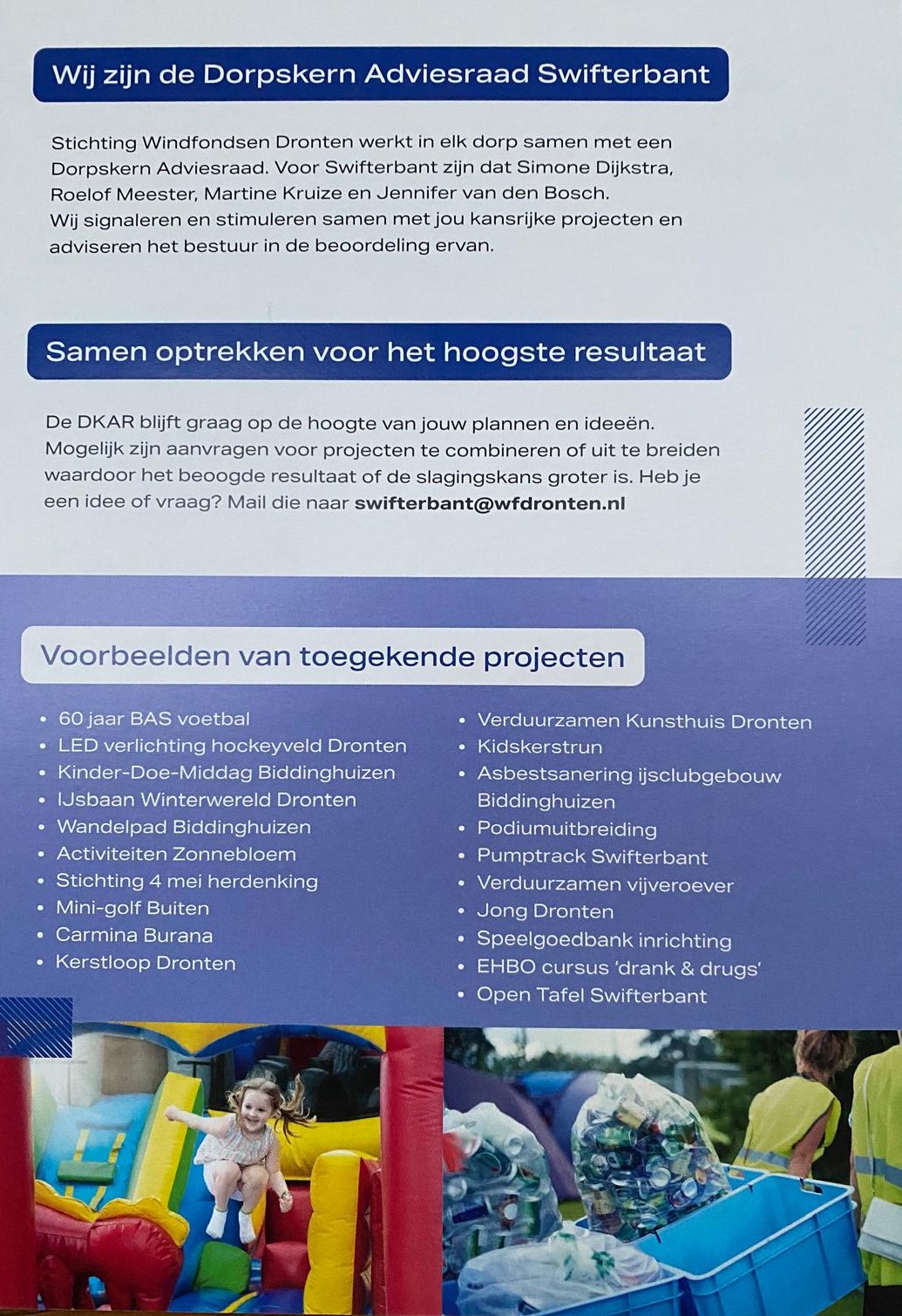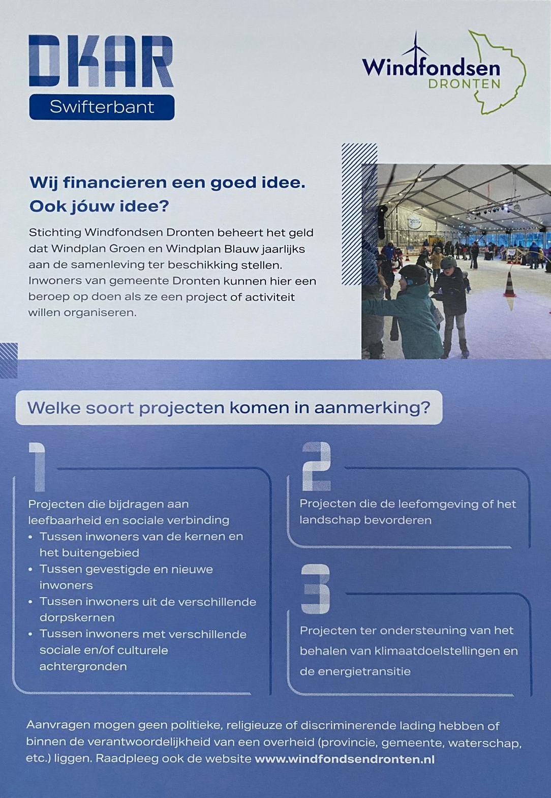 DKAR blijft graag op de hoogte van alle plannen die betrekking hebben op een bijdrage uit Windfondsen Dronten. Mogelijk zijn aanvragen te combineren of uit te breiden waardoor het beoogde resultaat of de slagingskans groter is. Heeft u een idee of vraag? Mail die naar Swifterbant@wfdronten.nl